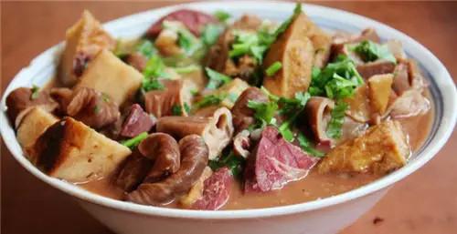 麻豆腐:豆渣發(fā)酵后,用韭菜、黃豆、羊肉等炒出來,澆上辣椒油,酸、復合辣、韭菜香、羊肉香,真是好吃,一點兒不膩。這道菜我非常推薦,雖然名氣不大。