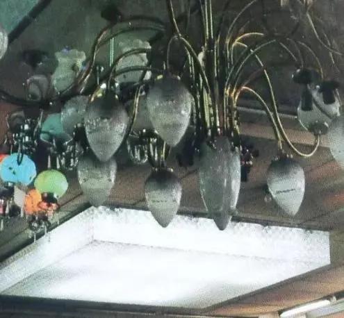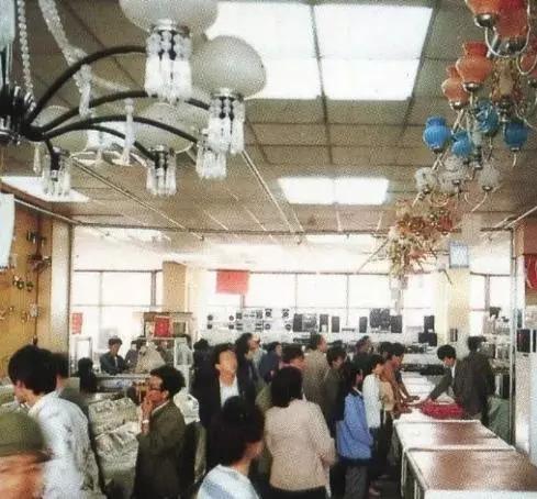 這一定是聯(lián)營公司燈具部的銷售區(qū),棚頂上吊著各種燈具。現在的百貨商店再也找不到賣燈具的了。