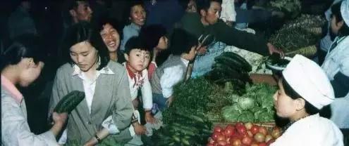 這張照片像是在秋季拍攝,也有擺拍“嫌疑”。因為在那個年代平時副食品商場的蔬菜柜臺品種絕沒有這么豐滿齊全。照片上的很多顧客對拍攝者都投來了關注的目光。