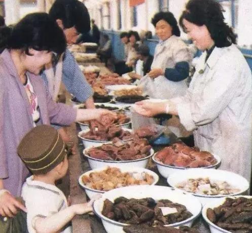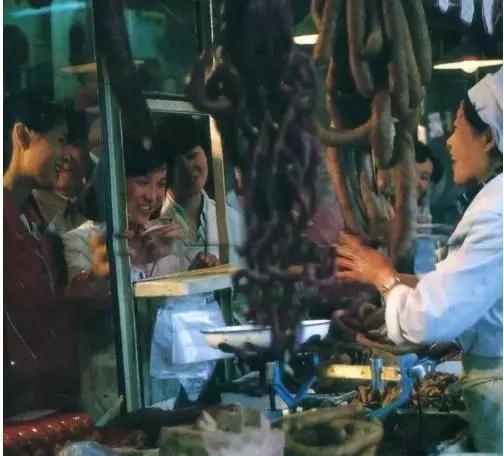 這是皇姑副食品商場的熟食柜臺,與前面的醬菜柜臺一樣,這里與顧客也是用玻璃隔斷分開的??吹焦衽_內擺放的各種熟肉和香腸,感覺這張照片應該是事前又準備的擺拍。因為那時副食商場熟食柜臺上很難看到如此豐滿的情景。
