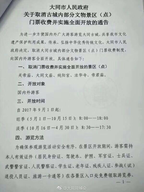 9.1日起大同古城(關(guān)帝廟,大同文廟,純陽宮,法華寺,帝君廟)這些景區(qū)要免費(fèi)開放啦!只需有效證件即可換去景區(qū)參觀票。